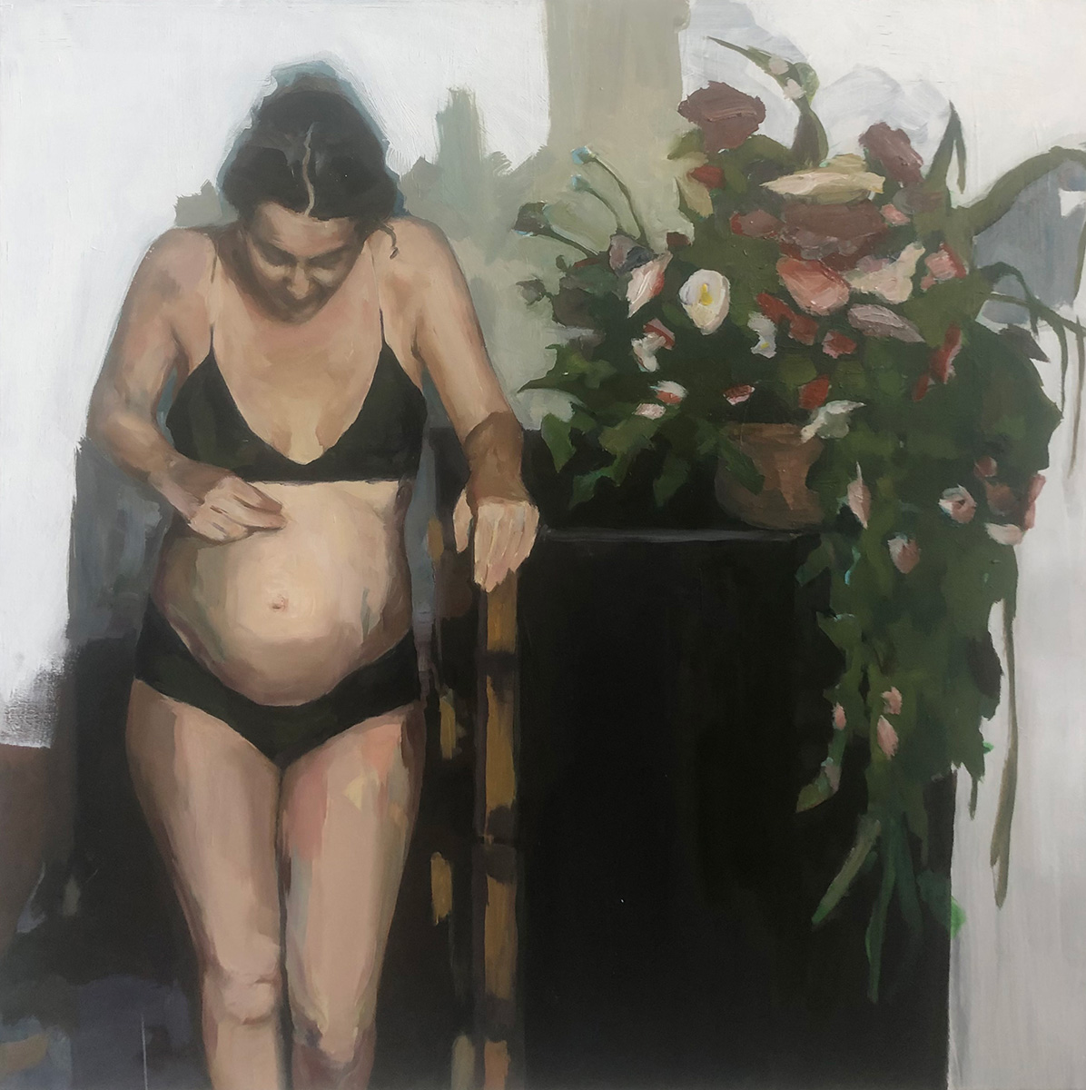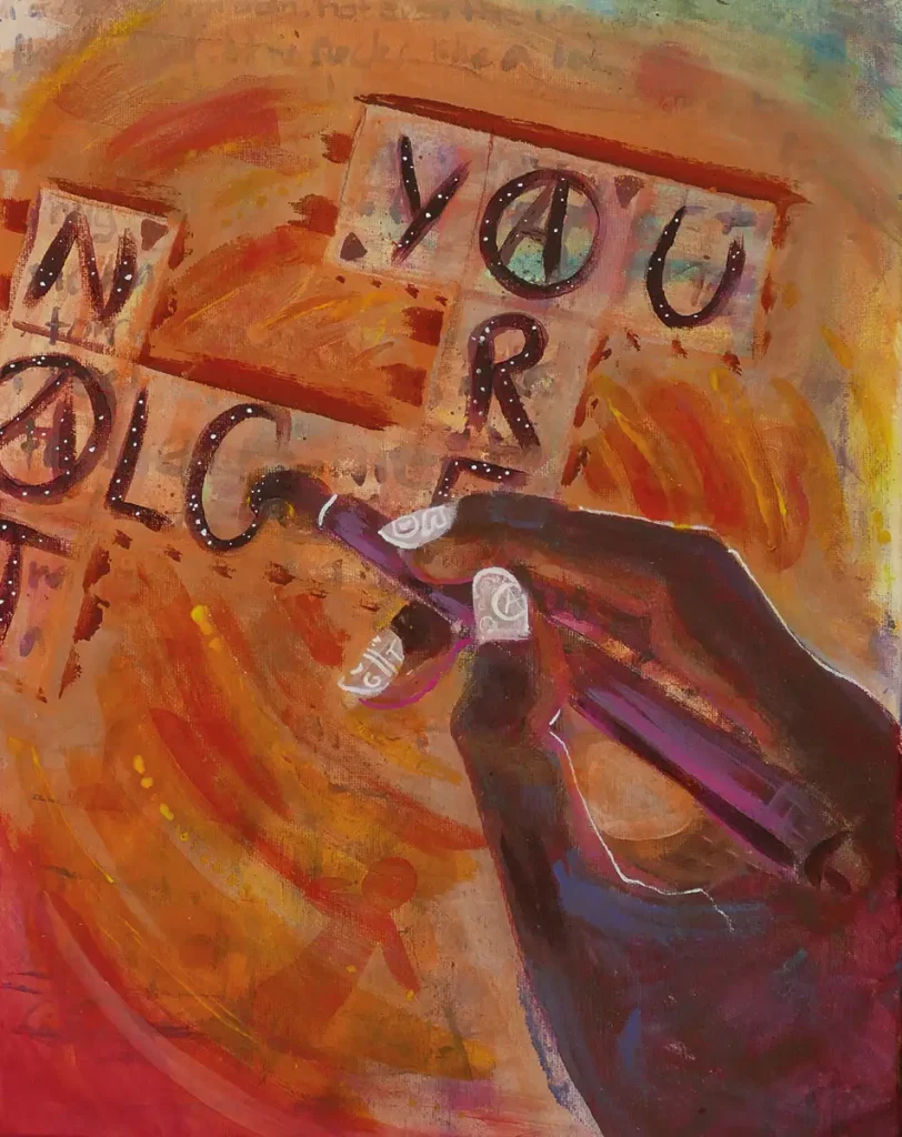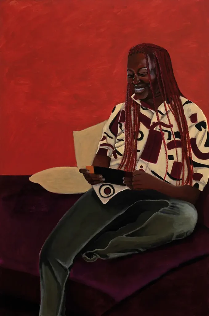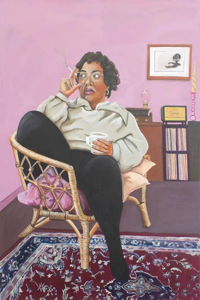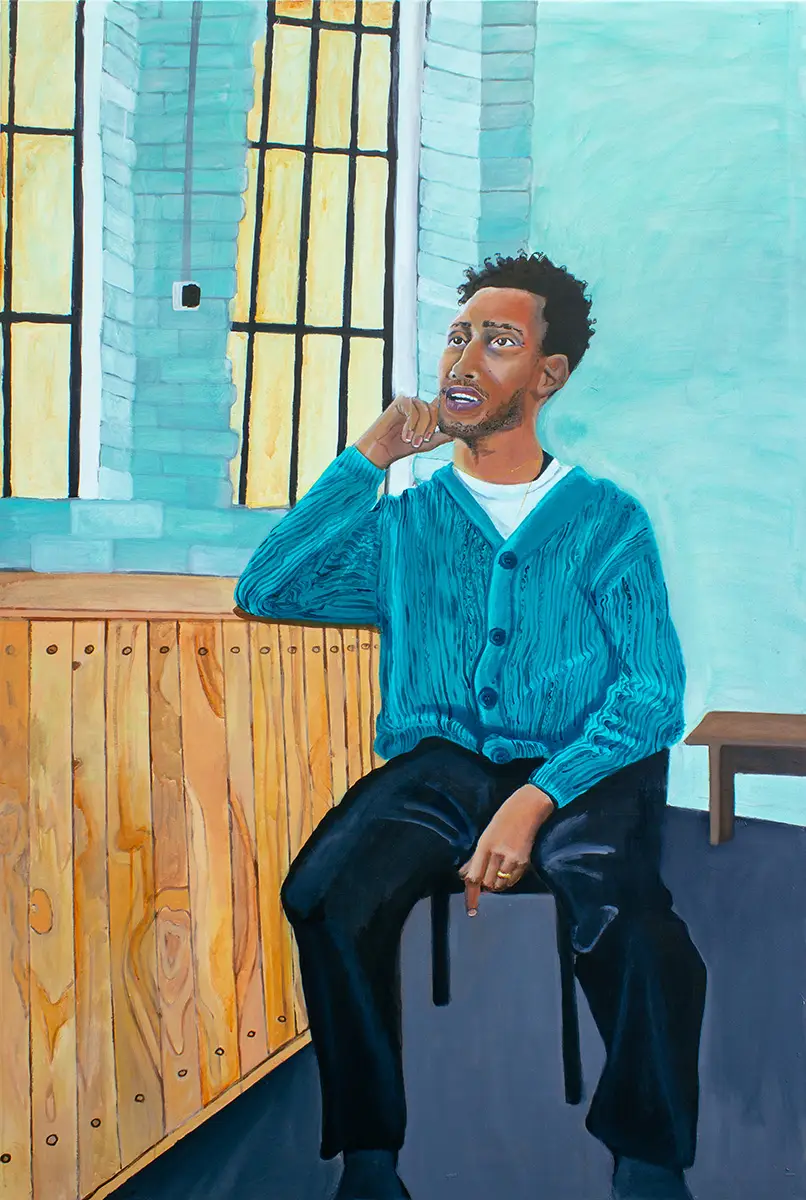 Meine Porträts basieren auf einem gemeinsamen konzeptuellen Ansatz. Sie zeigen junge schwarze Kulturschaffende aus meinem Umfeld. Amanda kann als Vorläufer der aktuellen Serie gelesen werden. Sie ist Illustratorin und Freundin. Godie betreibt einen Offspace in Köln mit Fokus auf Sichtbarkeit schwarzer Künstler*innen in Deutschland. Rebecca ist Künstlerin und Fotografin in Köln. Die Porträts entstehen nach fotografischen Sitzungen, die als dialogische Situationen angelegt sind. Die Dargestellten bestimmen die räumliche und symbolische Kulisse selbst, wodurch die Autor*innenschaft des Bildes bewusst geteilt wird. Während der Sitzungen findet ein offenes Gespräch statt, das künstlerische wie alltägliche Themen umfasst. Die Begegnung bildet die Grundlage für den malerischen Prozess. In der Überführung der fotografischen und skizzierten Vorlagen in Malerei erfolgt eine gezielte Reduktion visueller Informationen. Störende Details werden zurückgenommen, um den Fokus auf Gestik, Blick und körperliche Präsenz zu lenken.