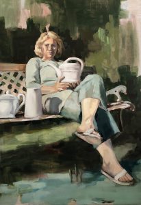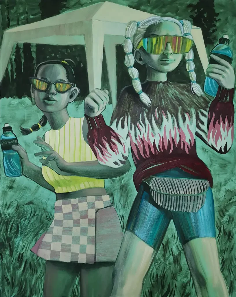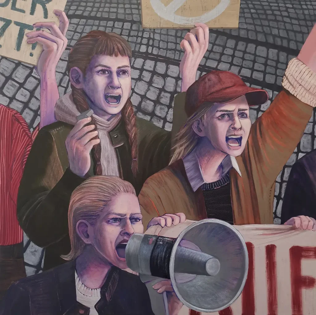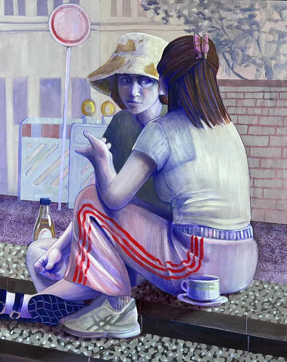 Für meine Bildfindung beobachte ich den städtischen Alltag junger Generationen. Mit einem nur scheinbar distanzierten, durchaus empathischen Blick studiere ich das Geschehen, das mich umgibt. In einer Mischung aus realen Beobachtungen und Fiktion konstruiere ich meine Figuren und Szenen. Um die Identifikation mit dem Dargestellten zu erleichtern, suche ich nach zeitgenössischen, kollektiven Erlebnissen wie beispielsweise der Teilnahme an einer Demonstration (Empörung), dem Tanzen auf Festivals (Power!) oder einem Gespräch zwischen Freundinnen, die am Straßenrand cornern. Mit dem englischen Bildtitel Spill the tea, umgangssprachlich für die neugierige Aufforderung zum Teilen von Geheimnissen, und der im Bild darauf anspielenden Teetasse gebe ich einen Hinweis auf die Natur des Gespräches der Protagonistinnen. Zu meiner künstlerischen Handschrift gehören die stilisierte Darstellung meiner Figuren und der Bruch durch den zumeist unnatürlichen Farbton, der sich wie ein künstlicher Filter über sie legt.