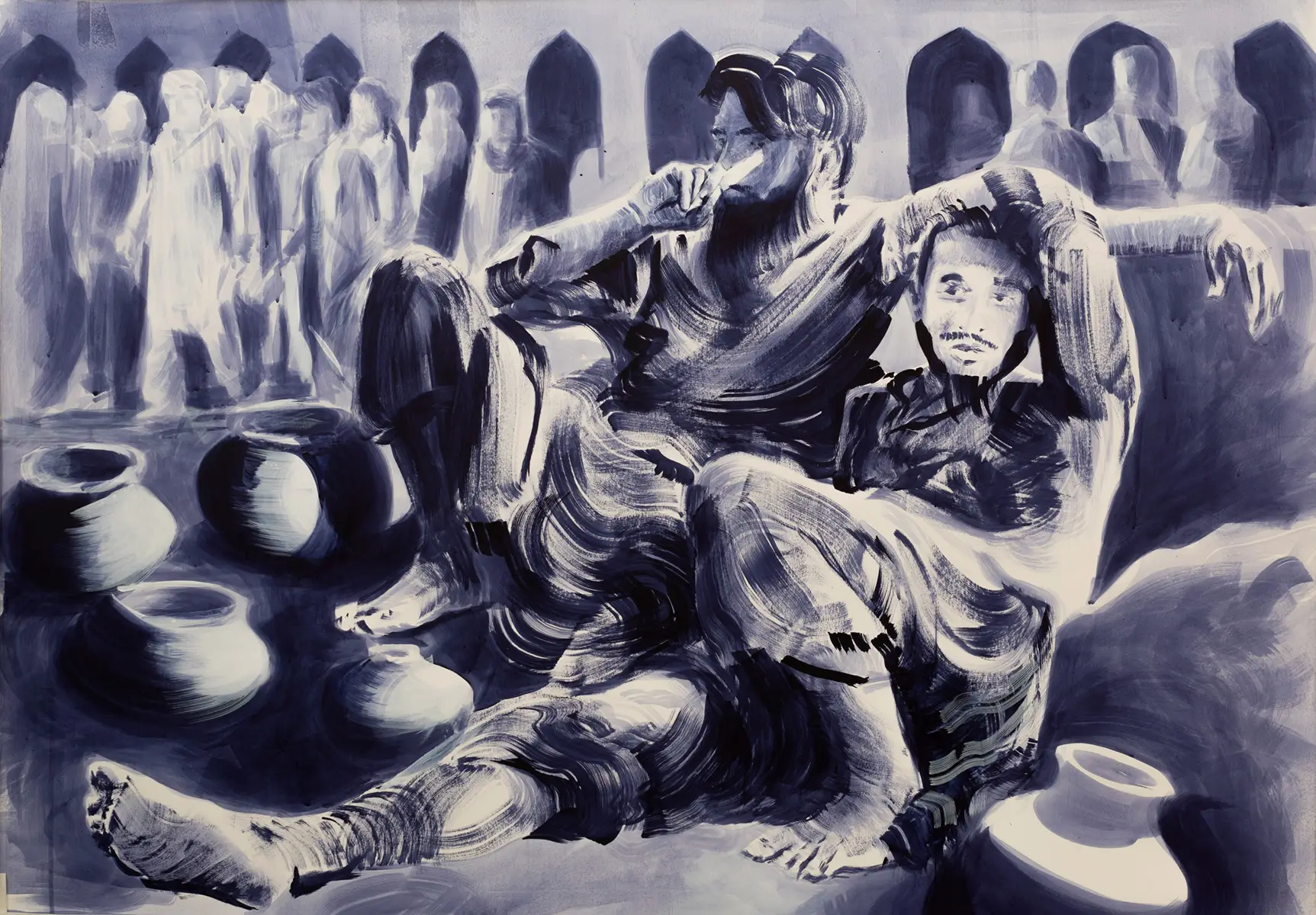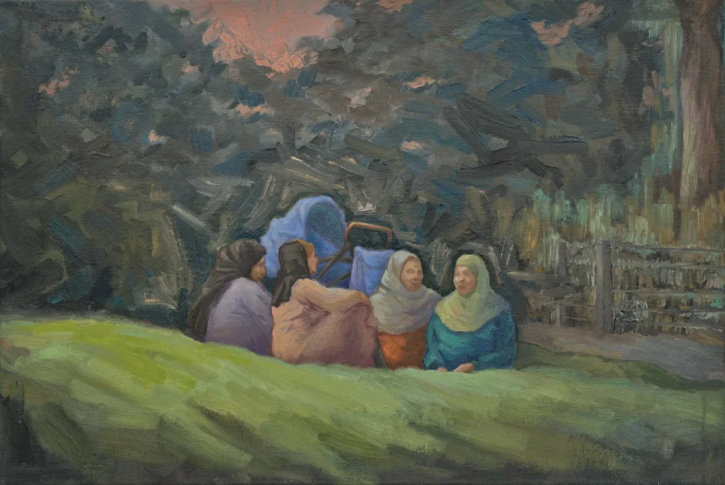 Meine Arbeit untersucht die Beziehung zwischen Individuum und Gesellschaft und stützt sich auf Kindheitserinnerungen und mein Aufwachsen in Pakistan. Beide Gemälde sind bewusst monochrom gehalten. Die Reduktion auf Tonwerte schafft Abstand von der farbgesättigten Wirklichkeit und lenkt den Blick auf Geste, Stimmung und Erzählung. Die Arbeiten befragen Wirklichkeit aus unterschiedlichen Perspektiven. Sie sind gegenständlich in der Darstellung und metaphysisch in der Absicht. Sie zeigen nicht nur äußere Ereignisse, sondern machen auch innere Prozesse sichtbar, die von Kultur, Identität und Emotion geprägt sind. Ich arbeite mit breiten, bewusst gesetzten Pinselstrichen, die Formen mit Perspektive und Tiefe aufbauen. Sie sind kombiniert mit Hinweisen auf Mimik und Gestik, die genug Raum für die Interpretation der Betrachtenden lassen. Die Werke sind ein Dialog zwischen dem Sichtbaren und dem Verborgenen und laden dazu ein, die eigene Vorstellung von Wirklichkeit zu überprüfen.