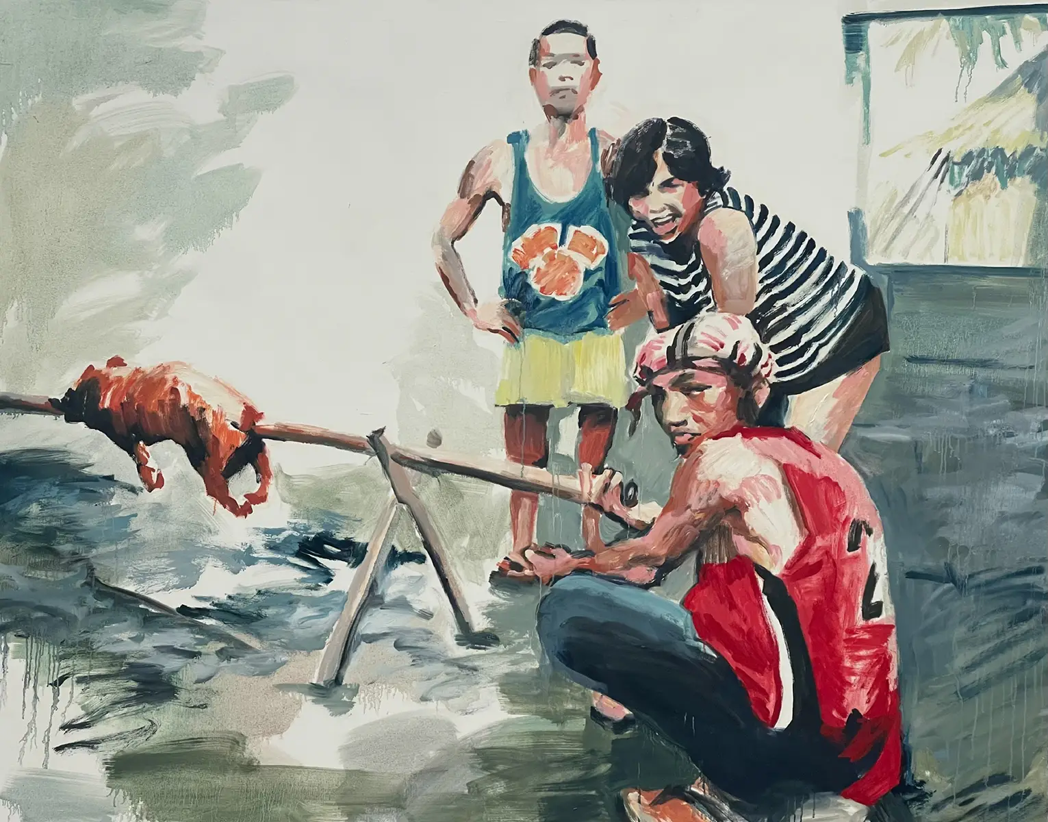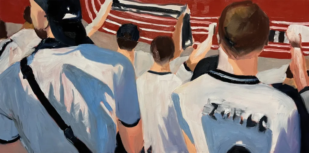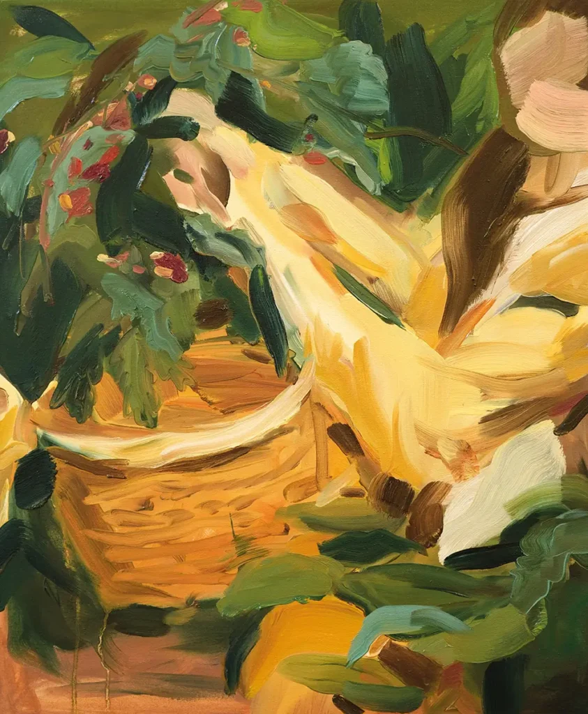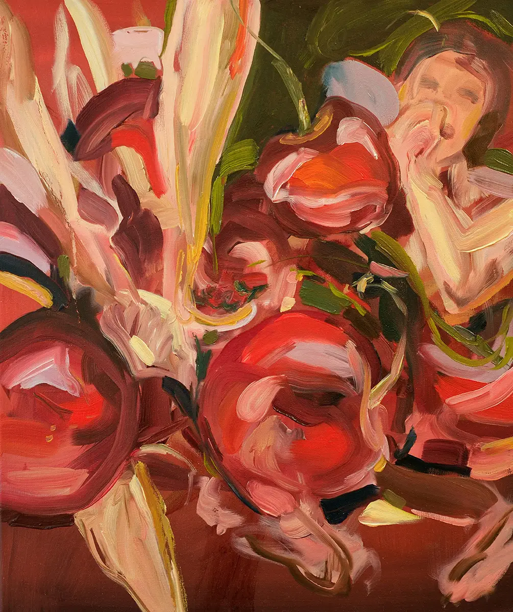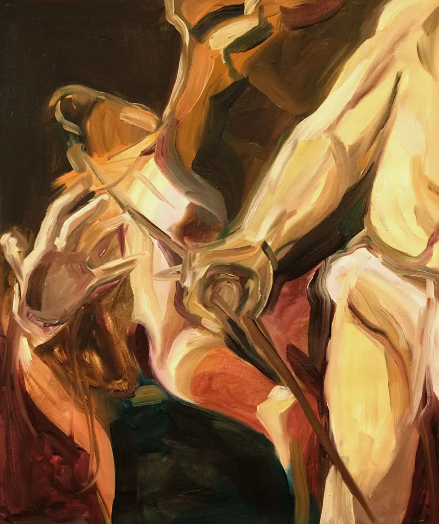 Was passiert, wenn Bewegung zur Malerei wird? In meinen Arbeiten gehe ich der Frage nach, wie Körperlichkeit und Bewegung durch den Pinselstrich ausgedrückt werden können – nicht als statische Darstellung, sondern als dynamischer Prozess. Ich versuche, eine Balance zwischen erkennbaren figürlichen Elementen und der freien Entfaltung von Farbe, Form und Bewegung zu finden. Die Frage ist dabei nicht, wie ein Moment aussieht, sondern wie sich seine Spannung malerisch erfahrbar machen lässt. In Schicksalsfaden spüre ich der barocken Bildtradition nach: dem dramatischen Einsatz von Licht, der dynamischen Komposition, der körperlichen Spannung. Während dieser historische Einfluss präsent bleibt, richtet sich mein Blick in Gier und Sammeln stärker auf alltägliche, universelle Gesten – das Pflücken, Sammeln und Essen von Kirschen. Auch hier interessiert mich weniger das Motiv als der Vorgang selbst: das Greifen, Reißen, Öffnen, Teilen. Die körperliche Energie dieser Handlungen wird im Pinselstrich weitergeführt und transformiert.