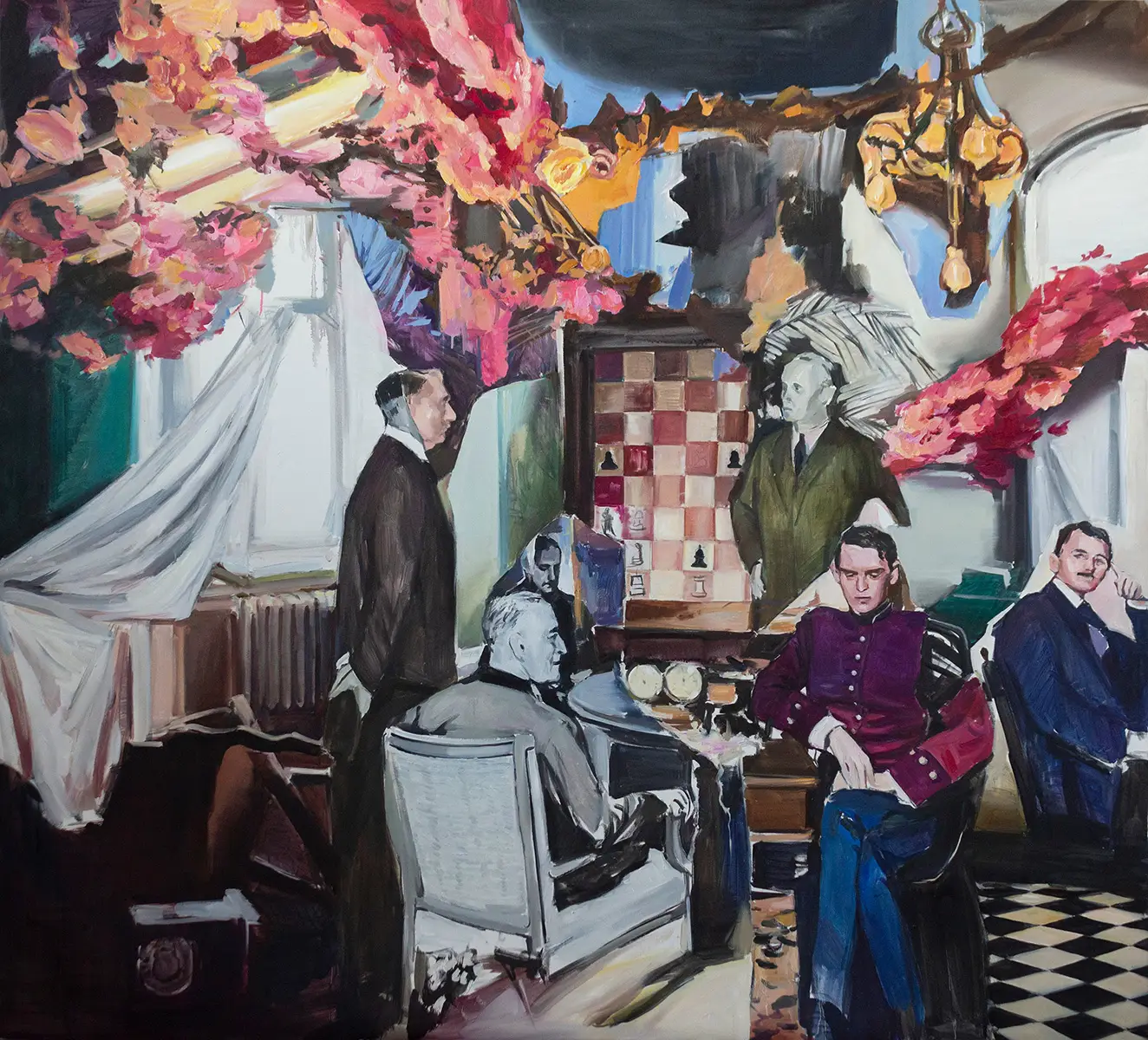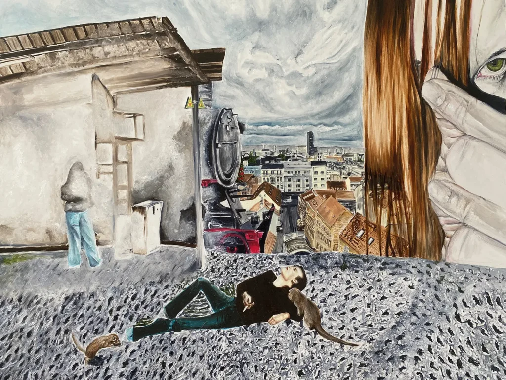 Meine künstlerischen Themen wurzeln in meiner Biografie als junge Frau in Russland im 21 Jahrhundert – mit all den strukturellen Einschränkungen und inneren Widersprüchen. Daher thematisiere ich unter anderem Machtverhältnisse, Geschlechterungleichheit, psychische Gesundheit, das Übersehen gesellschaftlicher Schwächen und die Kontrolle durch autoritäre Strukturen. Ich arbeite mit Symbolen, Assoziationen und Emotionen, um eine düstere und drückende Atmosphäre zu schaffen, in der mehrdeutige Szenen entstehen. Mein Ziel ist es, Verwirrung hervorzurufen, eine zerrissene Realität entstehen zu lassen, in der man sich orientierungslos fühlt. Ein wesentlicher Teil meiner künstlerischen Praxis ist die Arbeit mit Collagen und Archivmaterial. Ich recherchiere in Bibliotheken und Archiven, sammle Bildfragmente und entwickle daraus Szenen, die zwar fiktiv erscheinen, aber transhistorische Erzählungen und kollektive Erinnerungsbilder in sich tragen. Die Ästhetik der Collage bleibt sichtbar und prägt die Struktur der Gemälde entscheidend.