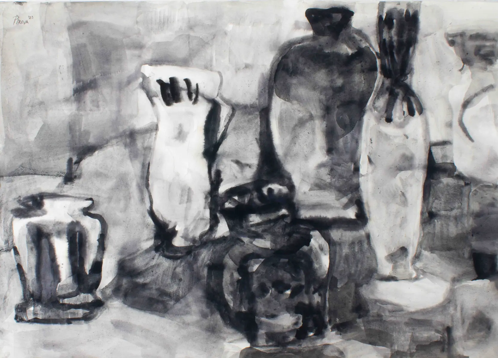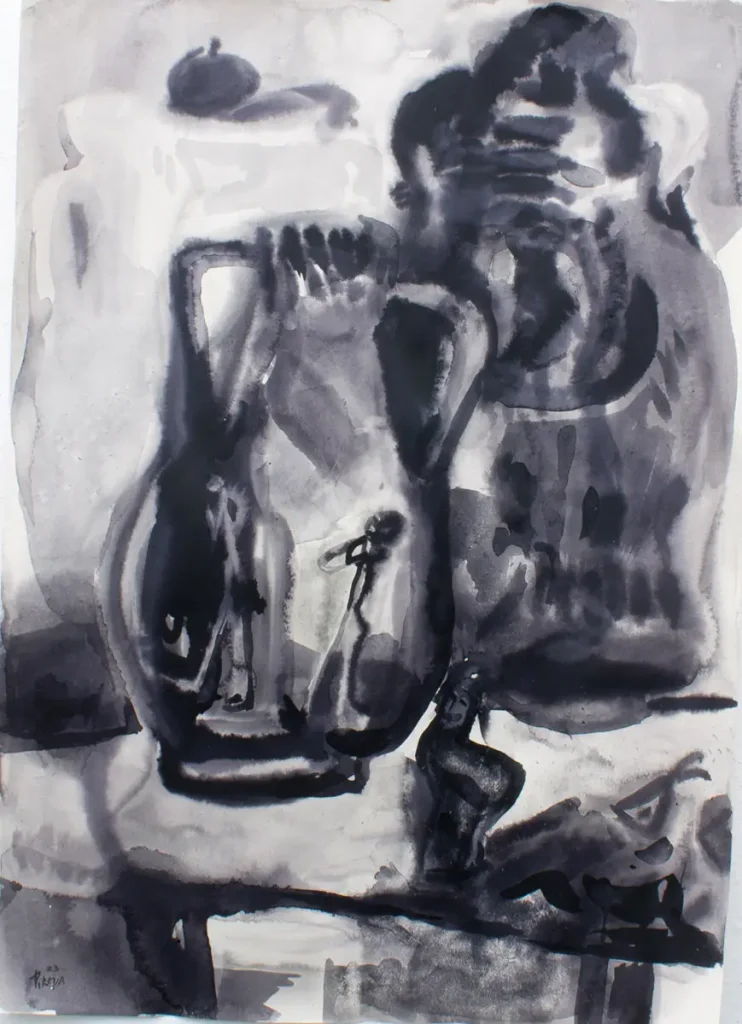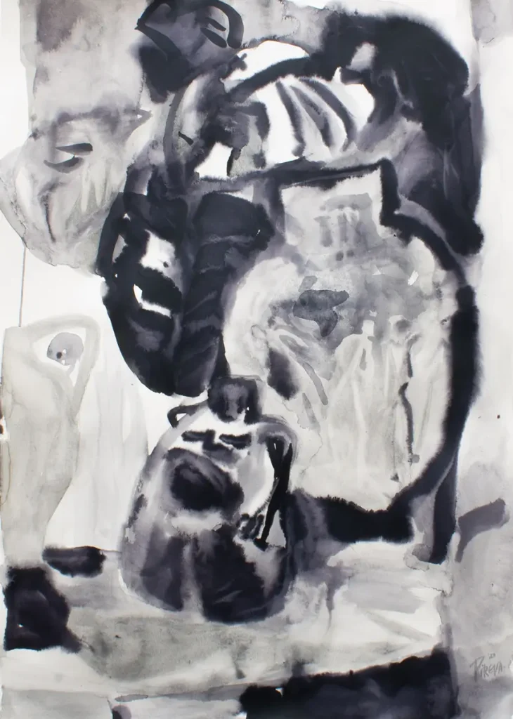 Im Zentrum der Bilderserie steht das Gefäß als Verkörperung von Erinnerung, Seele und Identität. Die Stillleben sind keine klassischen Arrangements, sondern Bühnen, auf denen Objekte unterschiedlicher Herkunft miteinander in Dialog treten. Jedes Gefäß erscheint wie eine Figur – mit eigener Form, Ausstrahlung und Geschichte, die Räume für stille Erzählungen und Zeitspuren öffnet. Die Gefäße treten in Beziehung zueinander, mal nah, mal distanziert, mal verbunden in Konstellationen zwischen Zusammenhalt und Individualität. Die Arbeiten entstehen als Tintenmalereien mit selbst hergestellter Gallustinte und knüpfen an die traditionelle Praxis der Farbherstellung im Malprozess an. Aufgewachsen an einem Ort, an dem antike Gefäße bis heute aus der Erde ausgegraben werden und Teil des Alltags sind, bleibt mir diese Nähe zum Alten als feines Gespür für Zeit, Form und Geschichte präsent. So erscheinen die Gefäße als Träger von Erinnerung und Identität – Spiegel einer Sehnsucht nach dem Rätselhaften und Zeitlosen.