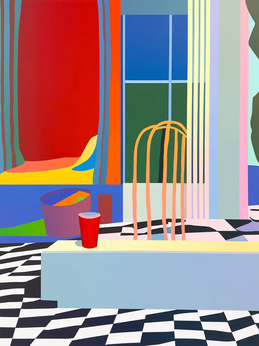 In meiner Malerei entwickele ich einen zeitgenössischen Kolorismus, der die Verflechtung von Wahrnehmung und Erinnerung im aktuellen Bilderleben erforscht. Dafür werden Smartphone-Fotografien alltäglicher Stadtszenen durch systematische Graustufen-Reduktion zu Hell-Dunkel-Strukturen transformiert. Diese Entkopplung von dokumentarischer Farbigkeit ermöglicht später eine autonome Farbkomposition als Trägerin der Bildstimmung. Der Malprozess erfolgt dann durch präzise Abklebung geometrischer Partien, die teilweise mit opaken Acrylverläufen bearbeitet werden. Dieser kontrollierte Balanceakt zwischen systematischer Konstruktion und intuitiver Farbsetzung erzeugt scharfe Konturen und intensive Kontraste, die rauschhafte Farberlebnisse bewirken. Die Arbeiten oszillieren zwischen gegenständlicher Lesbarkeit und Abstraktion, entziehen sich eindeutiger Zuordnung und hinterfragen etablierte Sehgewohnheiten. Farbe fungiert dabei als Trägerin emotionaler Inhalte, die sich nachhaltig im visuellen Gedächtnis verankern.
