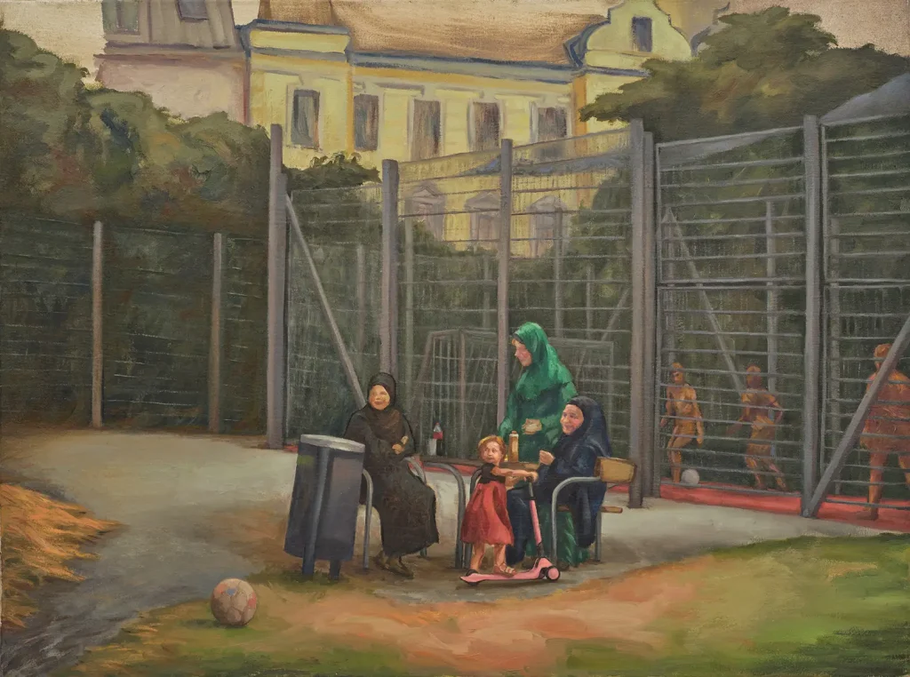 In meinen Arbeiten befasse ich mich mit der Funktionalität sozialer Räume und dem Spannungsverhältnis zwischen ihrer Ästhetik und derjenigen migrantischer Kulturen. Ich stelle kritische Fragen: Verwandelt sich die sozialistische Utopie mit der Zeit in eine Dystopie? Themen wie Verlust, Trauma, Posttrauma, Erinnerung und Unsicherheit durchziehen meine Szenen. Aufgrund dieser Komplexität tendiere ich zum künstlerischen Realismus: Die gegenwärtige Lage, beginnend mit dem Arabischen Frühling, bringt Brüche, Fragen und eine Poesie hervor, die direkt dargestellt werden müssen. Ich setze mich auch mit Nationalismus und Männlichkeitsbildern in Österreich auseinander – aus der Perspektive eines Mannes, der in einer patriarchalen Gesellschaft aufgewachsen ist, die auf nationalem Stolz beruht. Aus dieser Distanz heraus kann ich die Werte hinterfragen und dekonstruieren. Dieser Perspektivwechsel eröffnet einen Prozess der Selbstreflexion, der kulturellen Auseinandersetzung und der Identitätsprüfung.