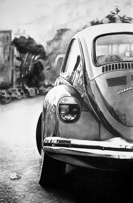 Das Publikum war begeistert von den großformatigen Kohlezeichnungen von Moritz Dümmel. Mehrheitlich wählten Besucherinnen und Besucher Dümmels virtuos ausgeführte Arbeiten, die auf nostalgischen Schwarz-Weiß-Fotografien basieren. Der Künstler wählt realistische Motive und bringt sie zu einer Konzentration auf das Wesentliche. „Wahrheit“ nennt er das, was er dabei herausarbeiten möchte. Die Holzkohle trägt er oft mit dem Pinsel auf, um die gewünschten Schattierungen zu erreichen. Faszinierend wirken etwa die Lichtspiegelungen auf dem glänzenden Kotflügel eines VW-Käfers.